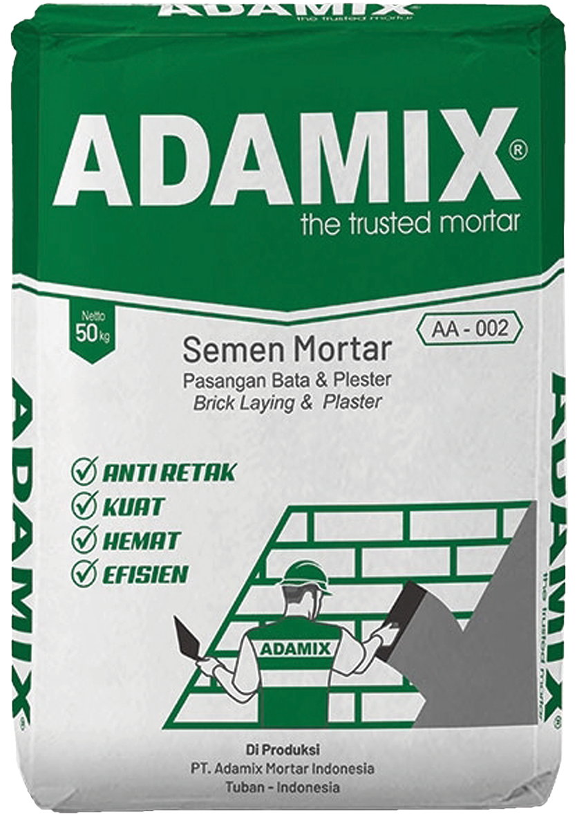 ADAMIX Plester merupakan produk plester kemasan yang terdiri dari campuran semen, pengisi, pasir, dan aditif sehingga hanya ditambah air dan diaduk untuk digunakan sebagai plesteran dinding yang menghasilkan kualitas lebih bagus dan efisien.